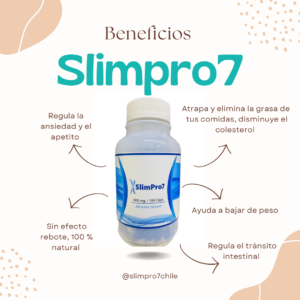 SlimPro7 suplemento 100% natural a base de una selección científica y exclusiva mezcla de fibras marinas que actúan de manera sinérgica para atrapar los lípidos ingeridos en las comidas, siendo arrastrados y eliminados por las deposiciones, lo que ayuda a disminuir el peso, grasa y  colesterol, mejorando a su vez el tránsito intestinal.  Sus componentes también tienen el poder de generar saciedad diminuyendo así la ansiedad y las ganas de comer.